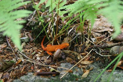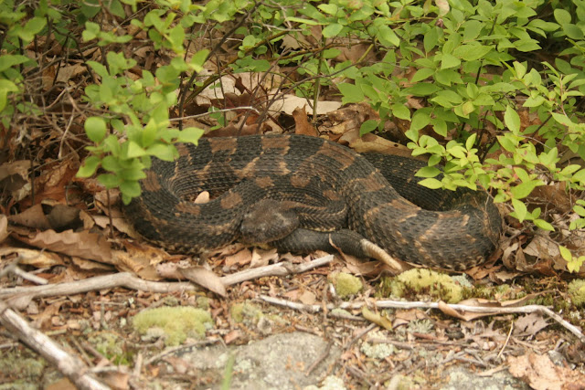 Although several species of herps were found they seem to be in low numbers; some local extirpations may be developing. The highlights were a large Timber Rattlesnake (well below), striking Eastern Garter Snake (2 below), Five-lined Skinks, Red Efts (below) and Wood Frogs.