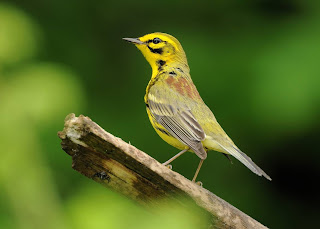 American Redstarts (above) are present in good numbers; a few hundred breeding pairs are no doubt feeding on the acceptable insect biomass of the forest. Ovenbirds (2 above) sing in the scores and here and there, in appropriate habitat, are a few Blue-winged (2 below), Black-and-White, Yellow, Louisiana Waterthrushes, Prairie Warblers (below) and Common Yellowthroats.